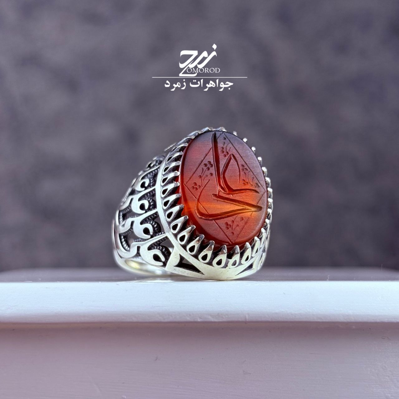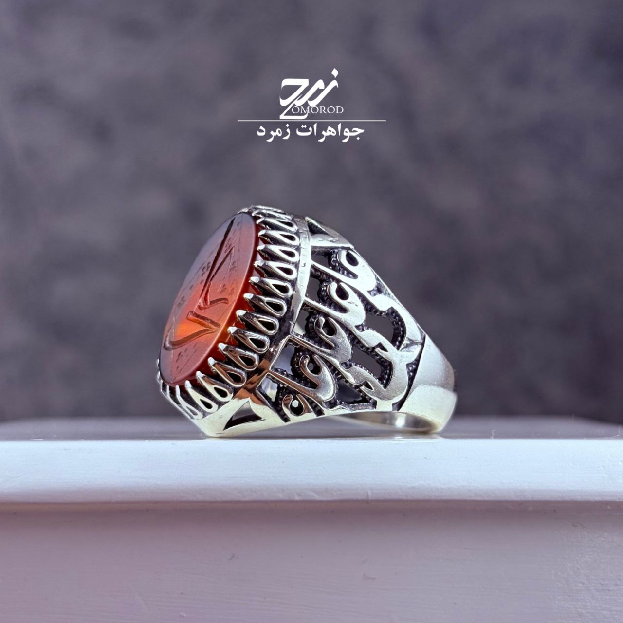 انگشتر نقره مردانه عقیق خطی سرخ دو رنگ حکاکی یا مرتضی علی