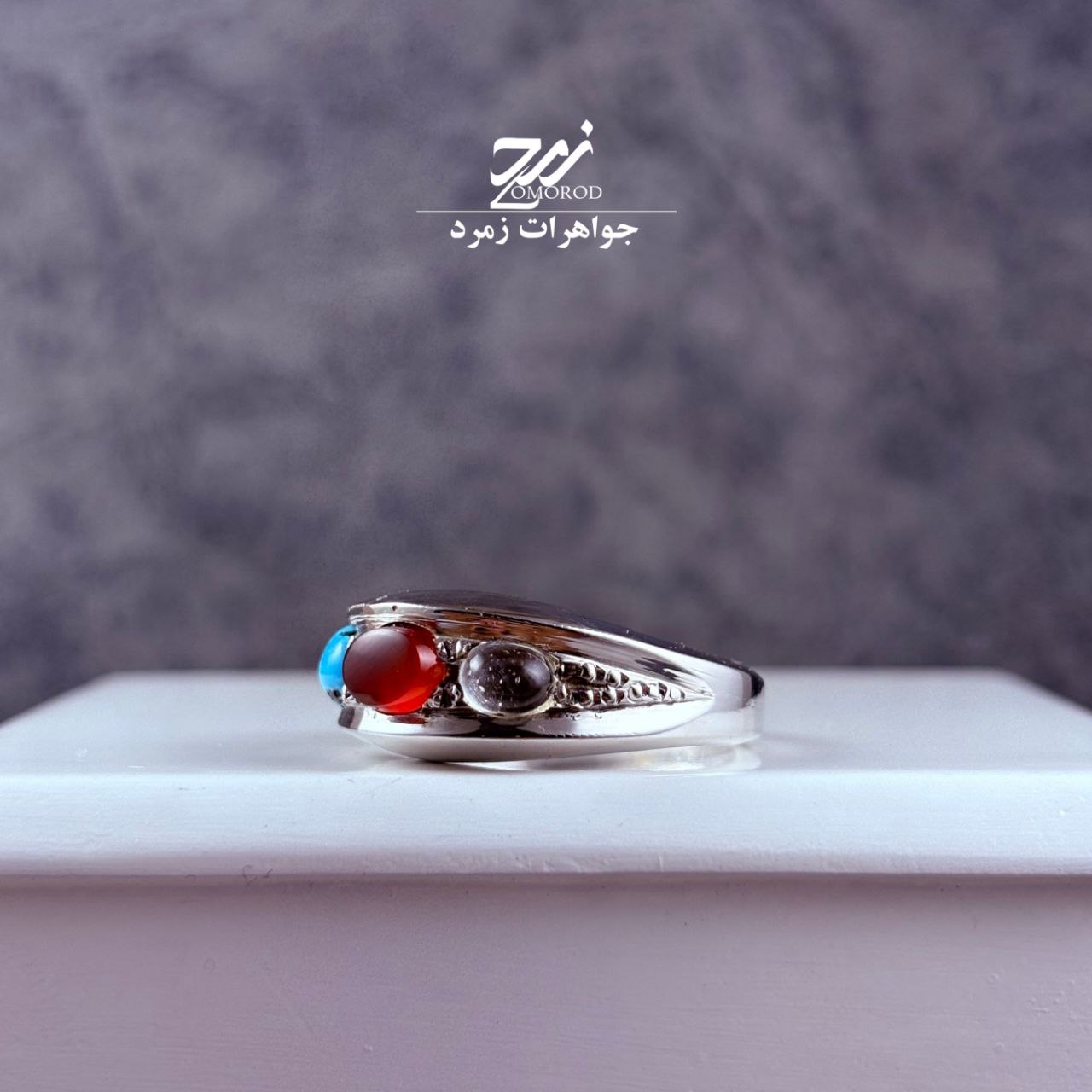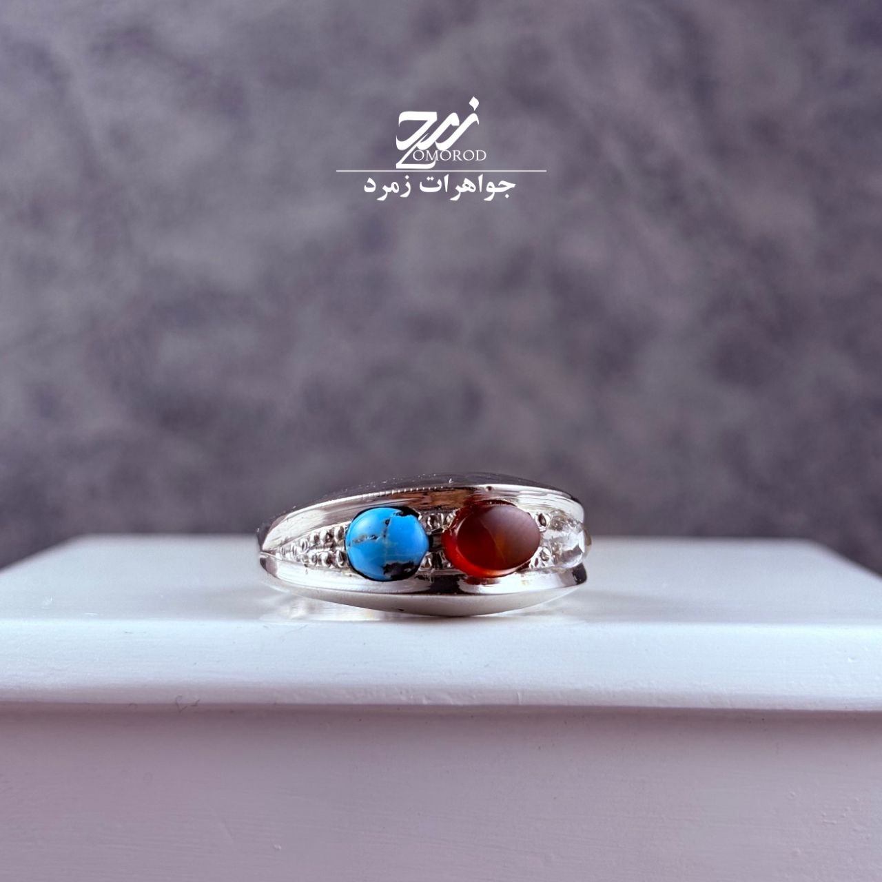 حلقه نقره مردانه دُر نجف، عقیق یمنی و فیروزه نیشابور